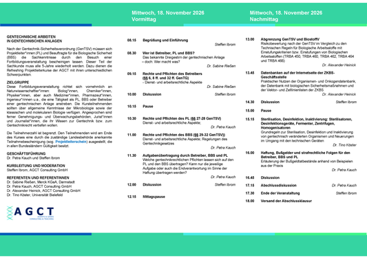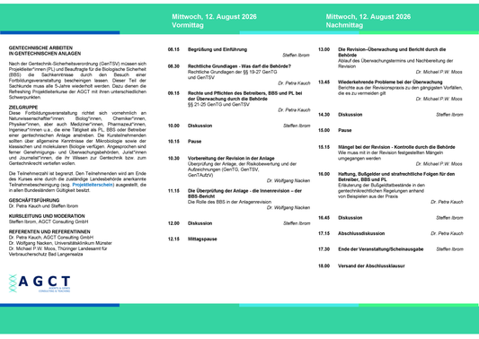 Alle anerkannten Seminare entsprechen dem Curriculum der LAG-Gentechnik und enthalten jeweils rechtliche Grundlagen, die Risikobewertung und Sicherheitseinstufung sowie die Sicherheitsmaßnahmen für gentechnische Anlagen.