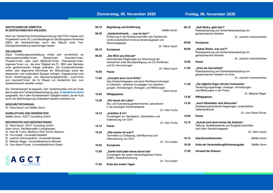 All recognized seminars correspond to the curriculum of the LAG-Gentechnik and contain legal principles, risk assessment and safety classification as well as safety measures for genetic engineering facilities.