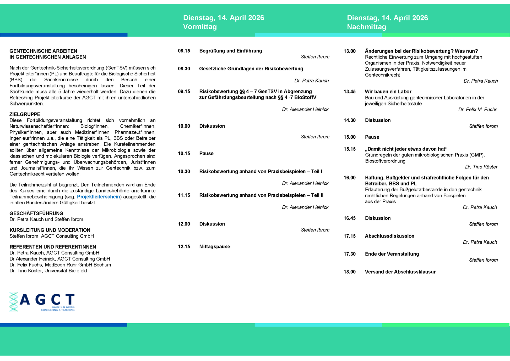 Alle anerkannten Seminare entsprechen dem Curriculum der LAG-Gentechnik und enthalten jeweils rechtliche Grundlagen, die Risikobewertung und Sicherheitseinstufung sowie die Sicherheitsmaßnahmen für gentechnische Anlagen.