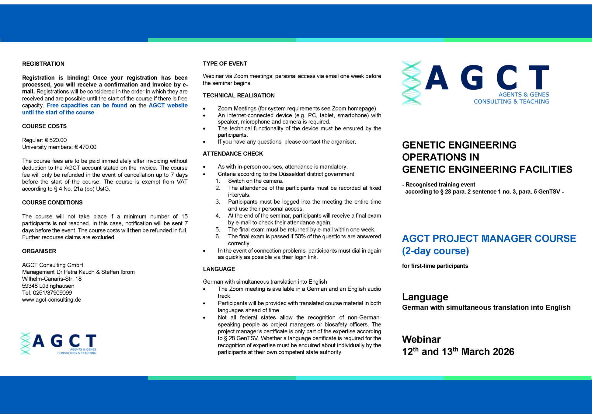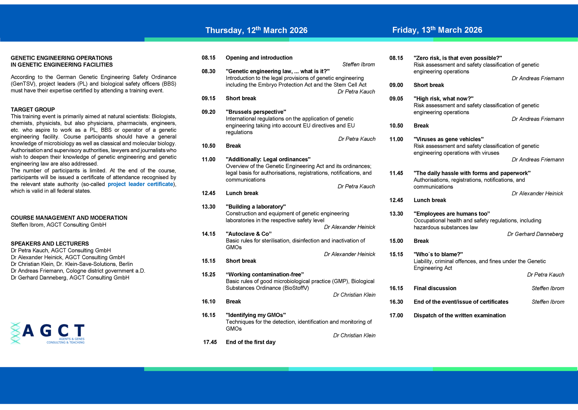 Alle anerkannten Seminare entsprechen dem Curriculum der LAG-Gentechnik und enthalten jeweils rechtliche Grundlagen, die Risikobewertung und Sicherheitseinstufung sowie die Sicherheitsmaßnahmen für gentechnische Anlagen.