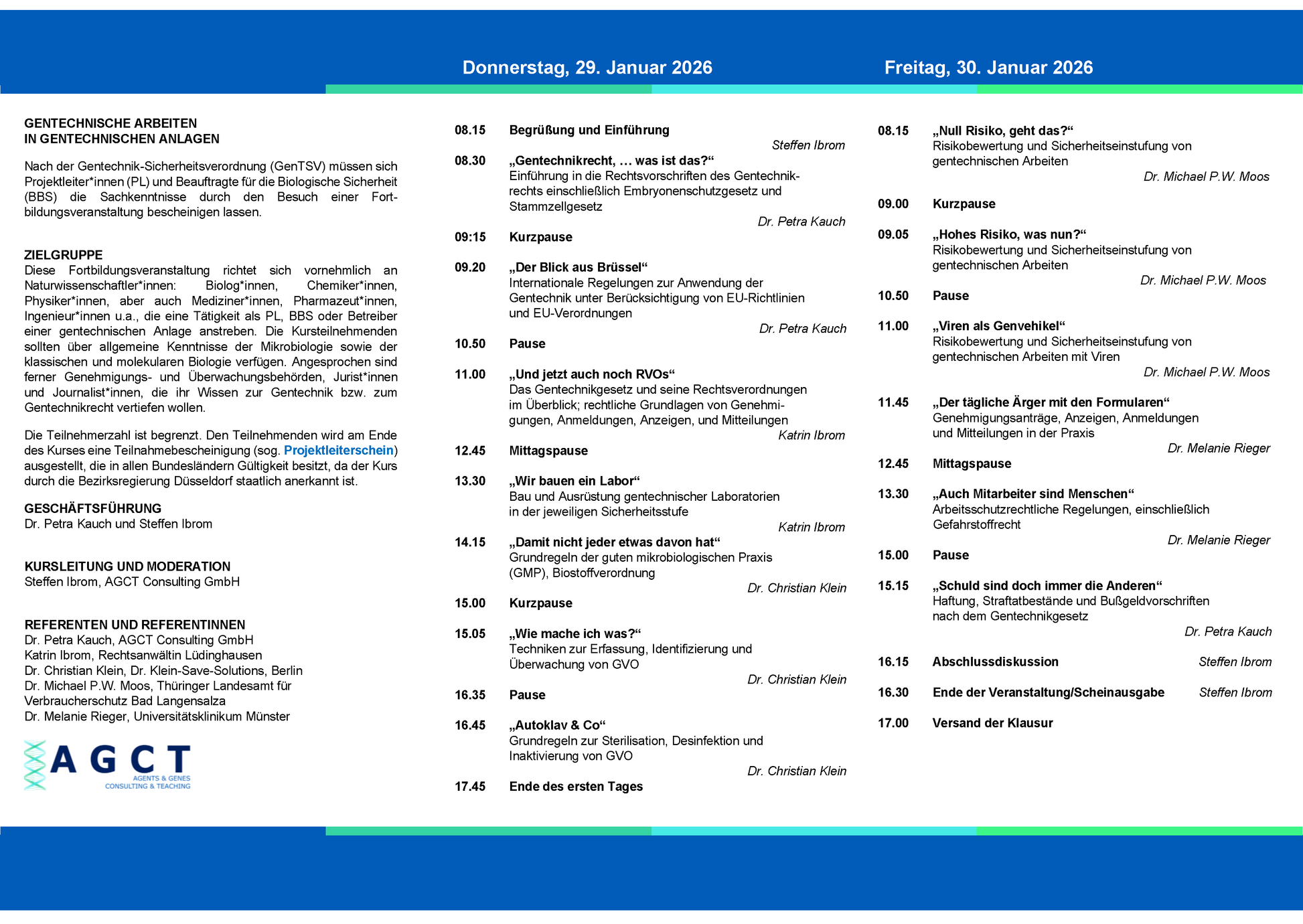 Alle anerkannten Seminare entsprechen dem Curriculum der LAG-Gentechnik und enthalten jeweils rechtliche Grundlagen, die Risikobewertung und Sicherheitseinstufung sowie die Sicherheitsmaßnahmen für gentechnische Anlagen.
