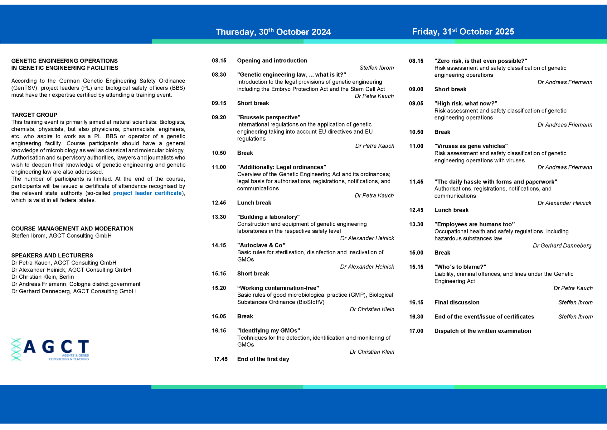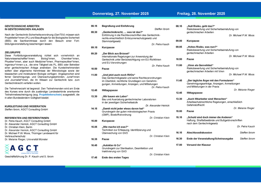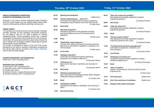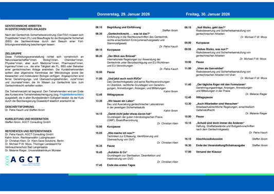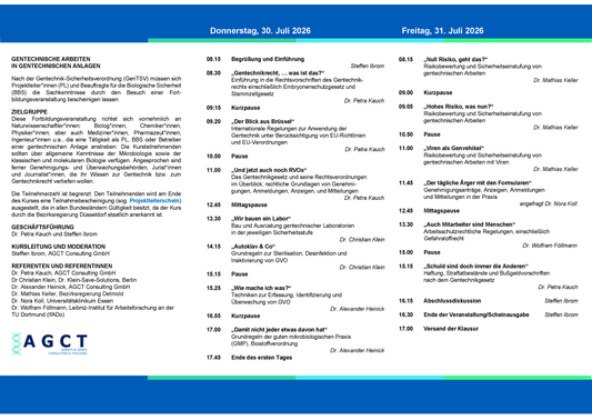 Alle anerkannten Seminare entsprechen dem Curriculum der LAG-Gentechnik und enthalten jeweils rechtliche Grundlagen, die Risikobewertung und Sicherheitseinstufung sowie die Sicherheitsmaßnahmen für gentechnische Anlagen.