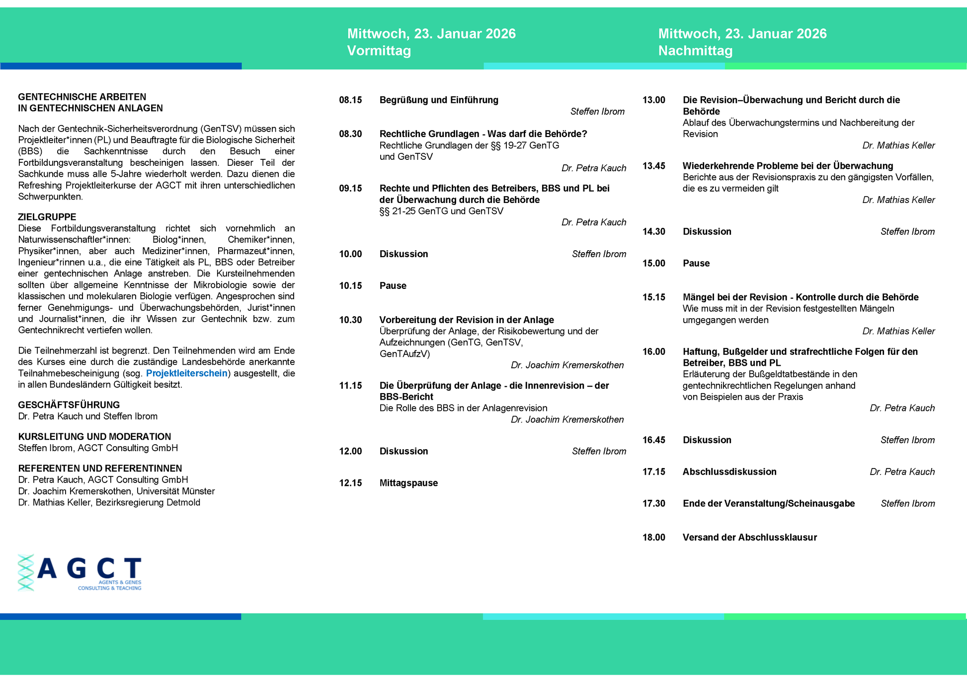 Alle anerkannten Seminare entsprechen dem Curriculum der LAG-Gentechnik und enthalten jeweils rechtliche Grundlagen, die Risikobewertung und Sicherheitseinstufung sowie die Sicherheitsmaßnahmen für gentechnische Anlagen.