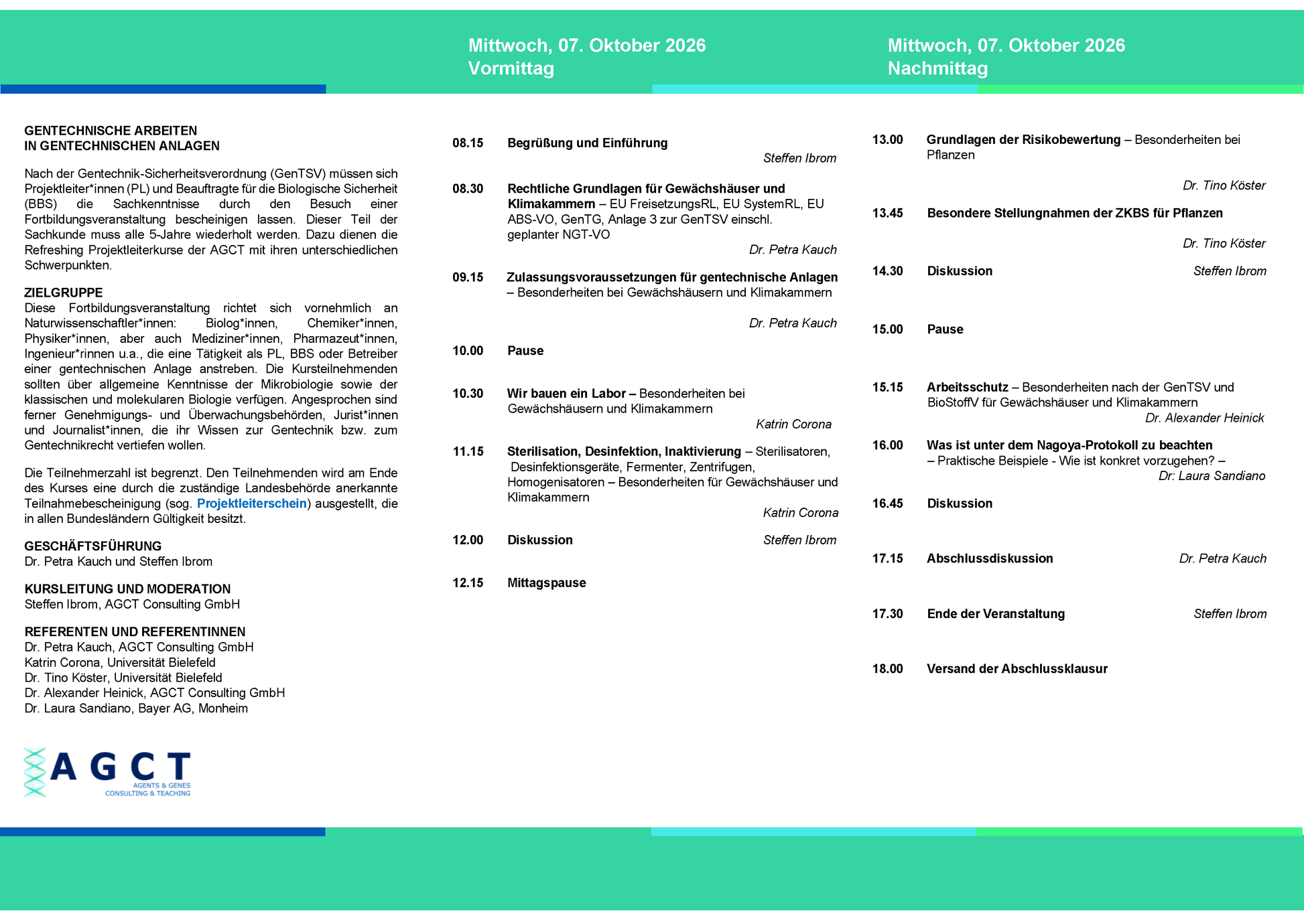 Alle anerkannten Seminare entsprechen dem Curriculum der LAG-Gentechnik und enthalten jeweils rechtliche Grundlagen, die Risikobewertung und Sicherheitseinstufung sowie die Sicherheitsmaßnahmen für gentechnische Anlagen.