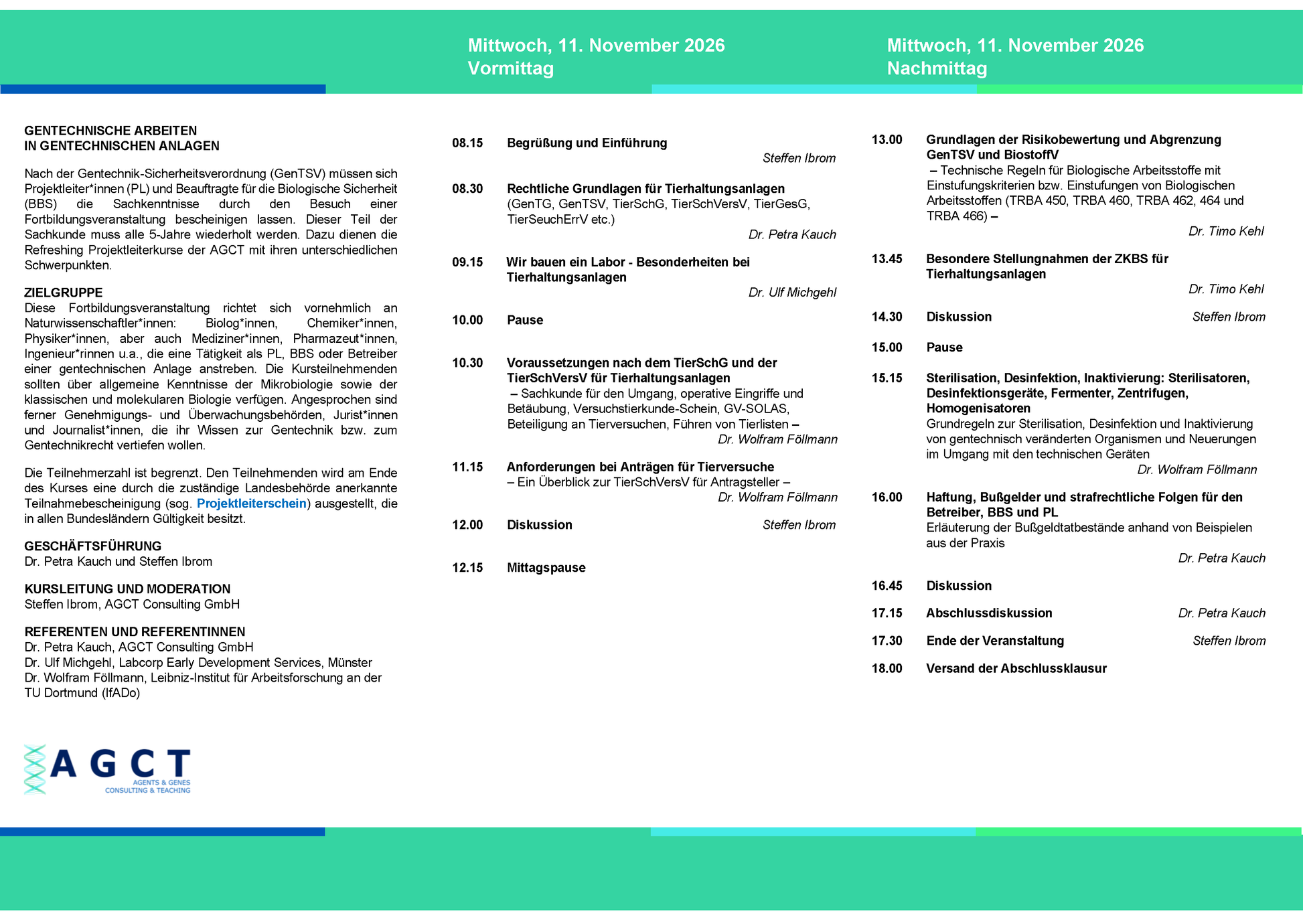 Alle anerkannten Seminare entsprechen dem Curriculum der LAG-Gentechnik und enthalten jeweils rechtliche Grundlagen, die Risikobewertung und Sicherheitseinstufung sowie die Sicherheitsmaßnahmen für gentechnische Anlagen.