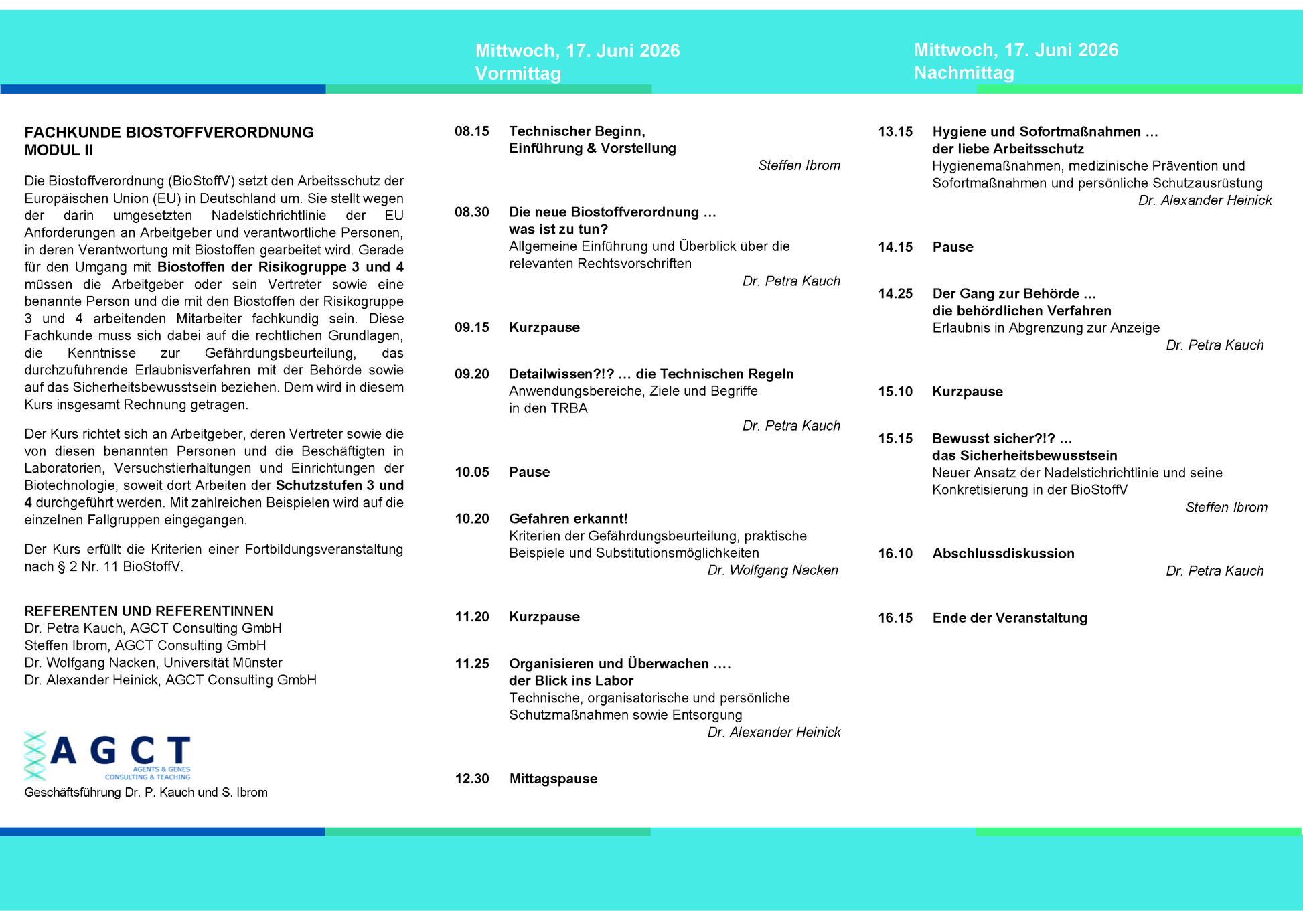 Mi. 17. Juni 2026 - AGCT Fachkundekurs nach BioStoffV - Modul II